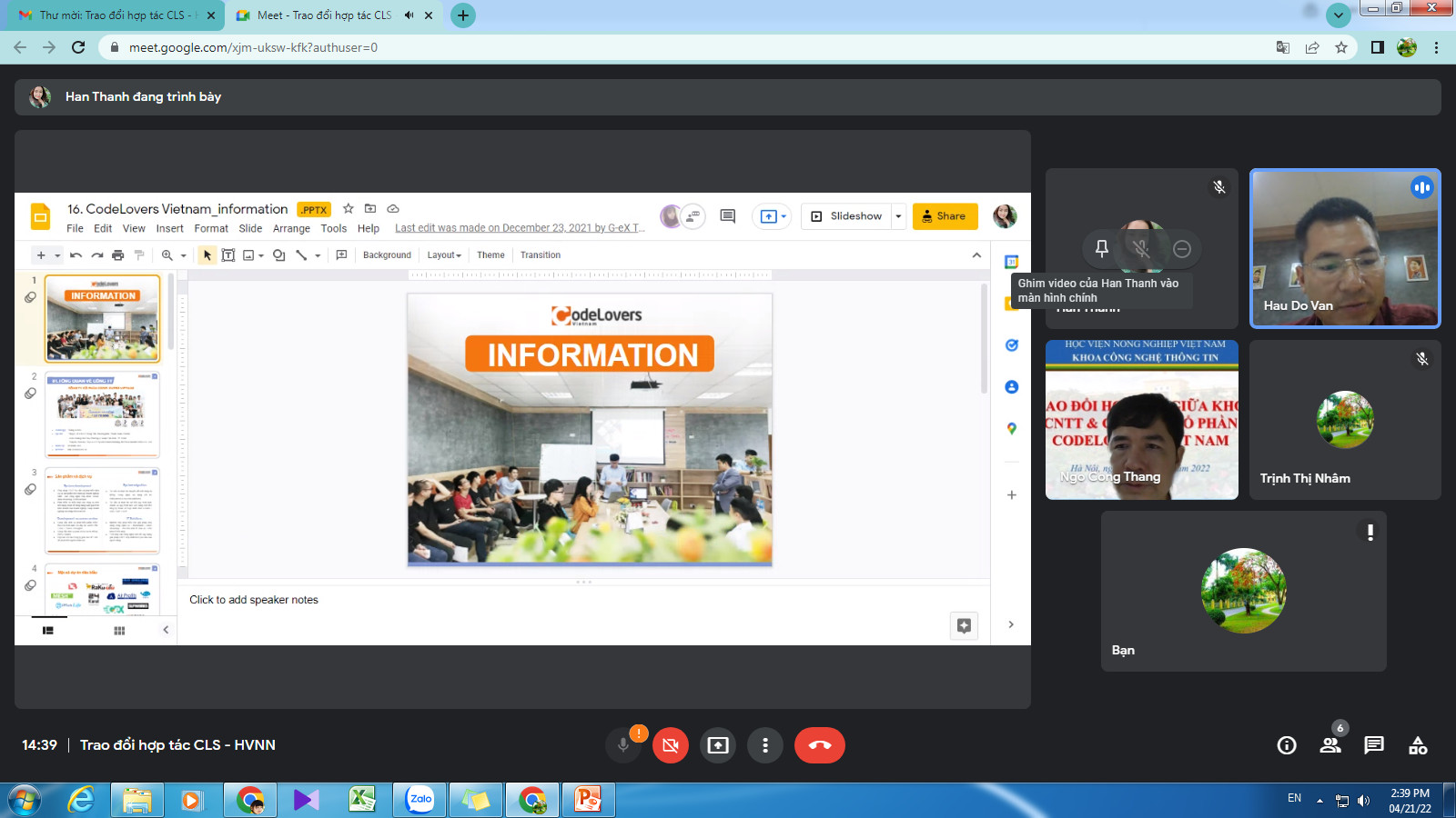 Chiều ngày 21 tháng 04 năm 2022, ông Đỗ Văn Hậu – Phó giám đốc Công ty Cổ phần Codelovers Việt Nam và bà Hàn Yến Thanh – Phụ trách tuyển dụng có buổi làm việc trực tuyến trao đổi hợp tác với Khoa Công nghệ thông tin. Tham gia buổi làm việc về phía Khoa có thầy Ngô Công Thắng – Phó Trưởng khoa phụ trách đào tạo và công tác sinh viên và cô Trịnh Thị Nhâm – Trợ lý đào tạo Khoa Công nghệ thông tin.