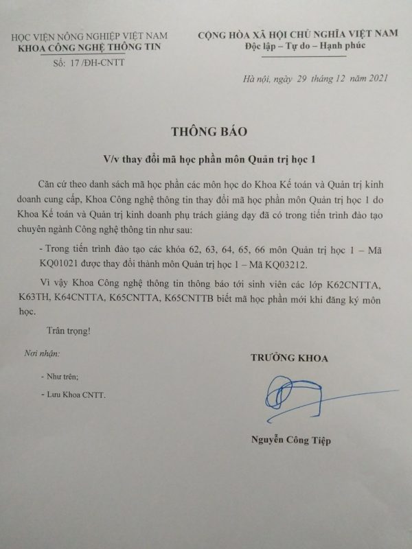 Thông báo thay đổi mã học phần môn Quản trị học 1