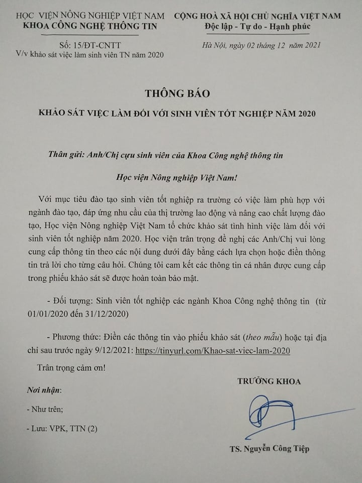 Thông báo về việc khảo sát việc làm đối với sinh viên tốt nghiệp năm 2020